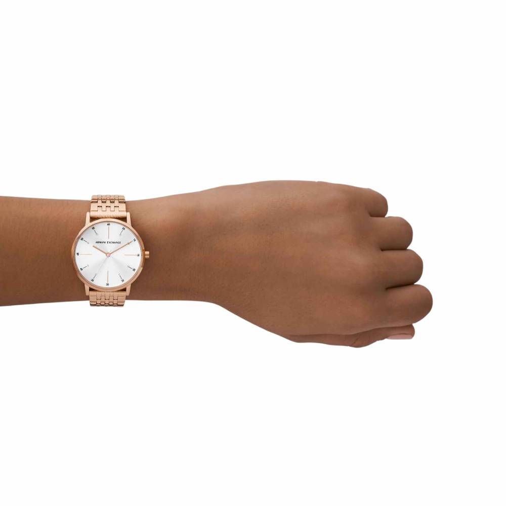 Armani Exchange's gift set includes a rose gold-tone stainless steel chain necklace and a 36mm watch featuring a white silver sunray dial, three-hand movement, rose gold-tone at least 50% recycled stainless steel case and rose gold-tone stainless steel bracelet.