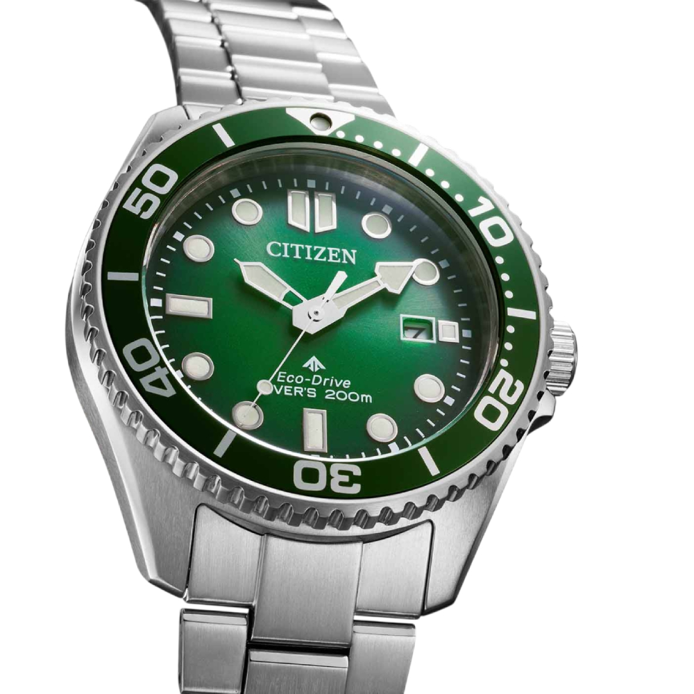 • The latest Promaster Dive timepiece blends rugged functionality with standout design. Crafted in gold-tone stainless steel and sized at a comfortable 41mm, it features a matching triple-link bracelet and a bold green unidirectional bezel for a sporty edge. The gradient green dial is designed for maximum visibility, with luminous applied hour markers and a distinctive handset that ensures clarity in all lighting conditions. A discreet date window at 3 o’clock adds everyday practicality. Powered by Citizen’s Eco-Drive technology—fueled by light, never needs a battery. This ISO-compliant diver is water resistant to 200 metres, and includes an exclusive dive tank box. Calibre E168.