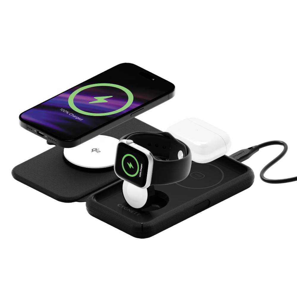 Cygnett ChargeBase Qi2.0 3-in-1 Magnetic Wireless Charger with 25W Wall Charger – Black