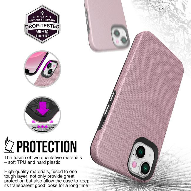 The triangle texture design on the PC back brings great grip and hand-feeling. Raise your lips to protect your camera and screen when your phone faces up and down. On the internal TPU, a triangle design provides heat dissipation to cool down your phone. What's more, independent tactile silver-plated buttons make your phone shine.